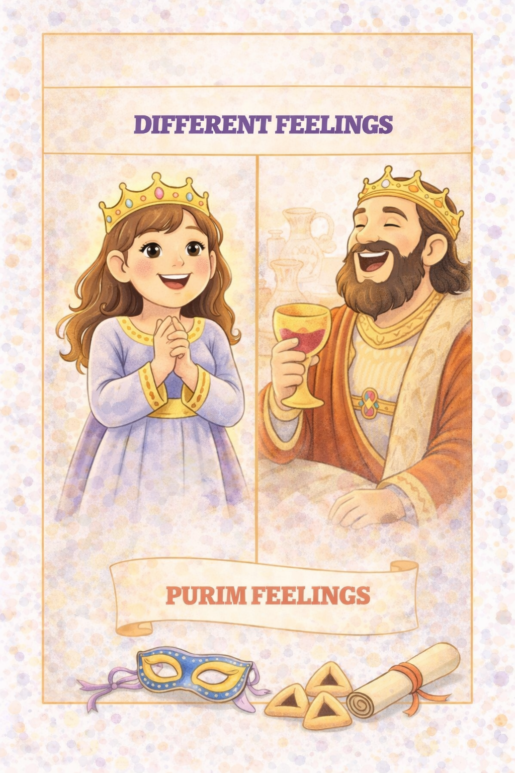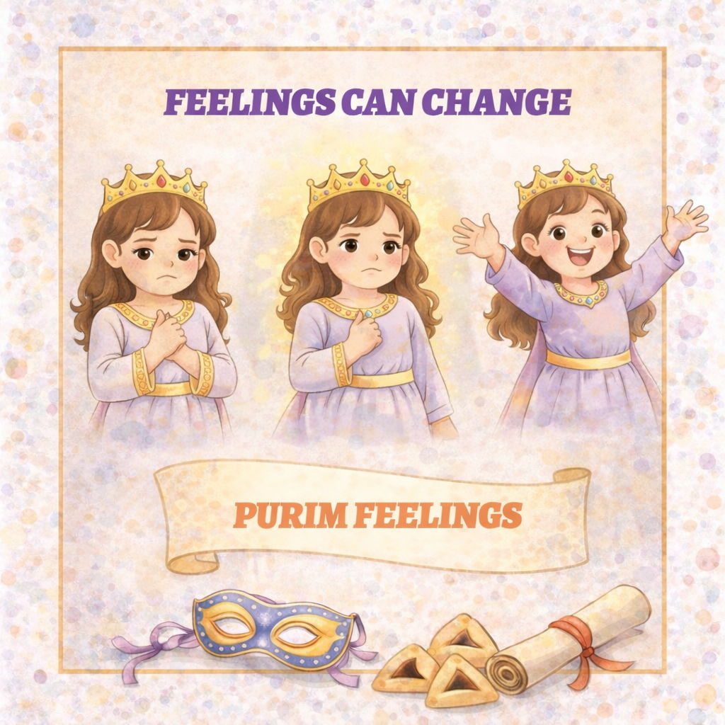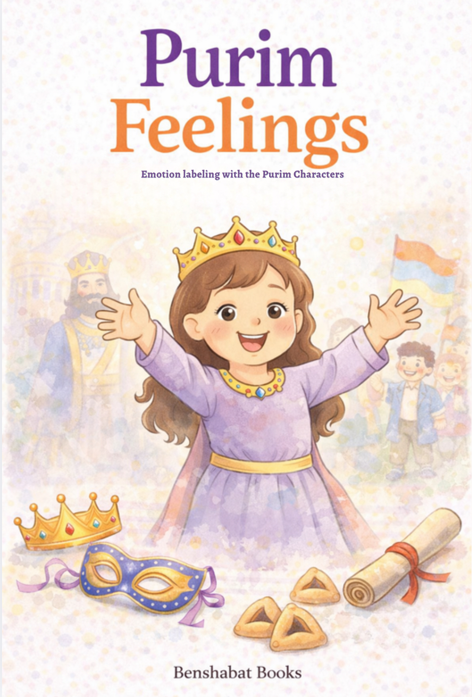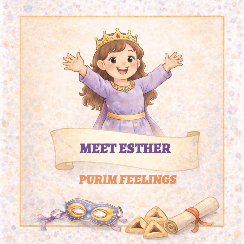 Purim Feelings introduces young children to emotional awareness through the beloved Purim characters. By exploring how Esther, Mordechai, Achashverosh, Vashti, Haman, and the Yidden feel at different moments in the story, children learn to recognize, name, and understand emotions in a gentle and meaningful way.